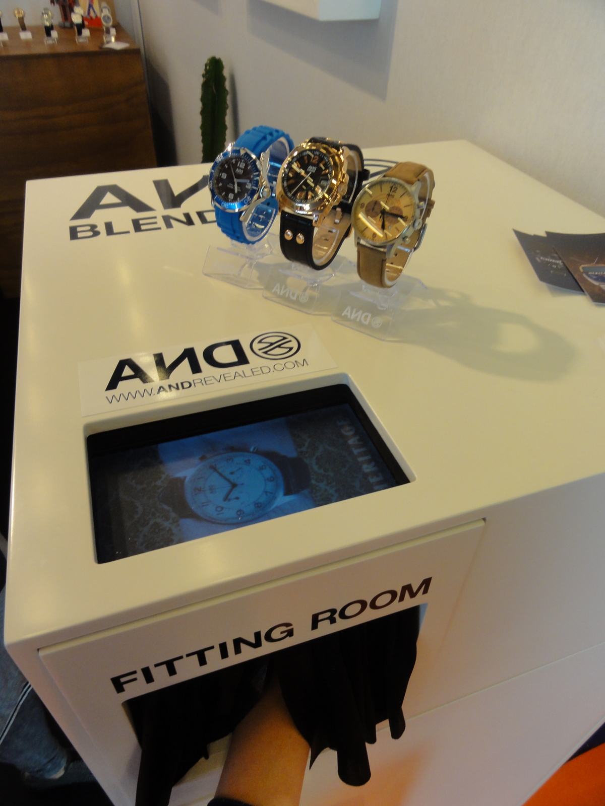 La deuxième innovation vient des Pays-Bas : la marque de montre AND a développé la plus petite cabine d’essayage du monde. En glissant votre main entre les rideaux, une animation se met automatiquement en route, et vos présente, sur « votre » poignet, les montres de la collection. Génial, non?