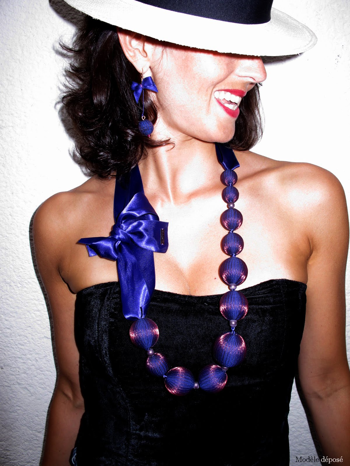 Un ruban de satin relie les perles entre elles, agrémenté parfois d’un nœud, d’une autre série de perles de plus petites tailles, et toujours de la marque, sur une délicate plaque de métal mat.